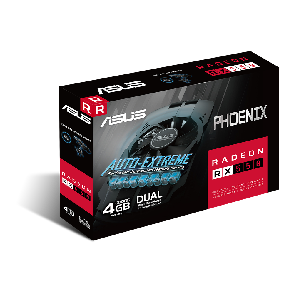 ASUS Phoenix PH-RX550-4G-EVO. Graphics processor family: AMD, Graphics processor: Radeon RX 550, Processor frequency: 1195 MHz. Discrete graphics adapter memory: 4 GB, Graphics adapter memory type: GDDR5, Memory bus: 128 bit, Memory clock speed: 6000 MHz. Maximum resolution: 5120 x 2880 pixels. OpenGL version: 4.5. Interface type: PCI Express 3.0. Cooling type: Active, Number of fans: 1 fan(s)