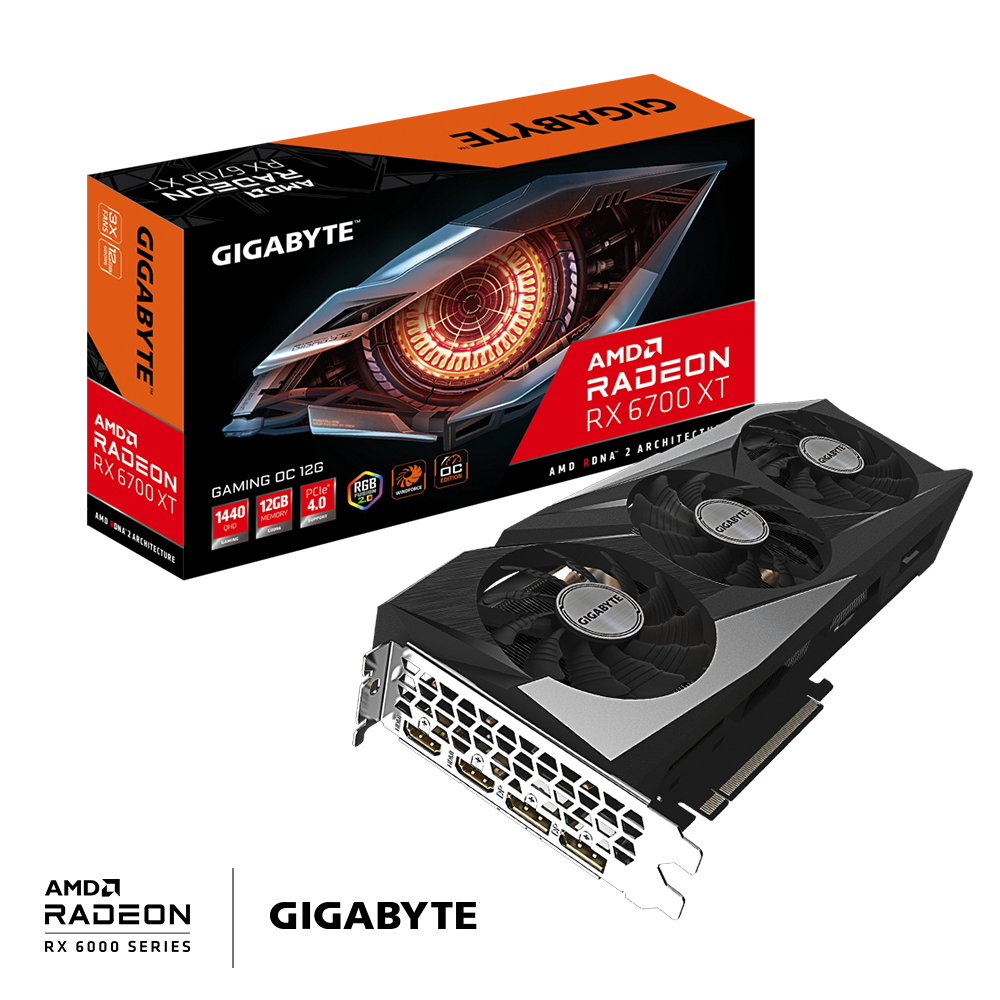 Gigabyte Radeon RX 6700 XT GAMING OC 12G. Graphics processor family: AMD, Graphics processor: Radeon RX 6700 XT. Discrete graphics adapter memory: 12 GB, Graphics adapter memory type: GDDR6, Memory bus: 192 bit, Memory clock speed: 16000 MHz. Maximum resolution: 7680 x 4320 pixels. DirectX version: 12.0, OpenGL version: 4.6. Interface type: PCI Express x16 4.0. Cooling type: Active, Number of fans: 3 fan(s), Illumination colour: Multi
